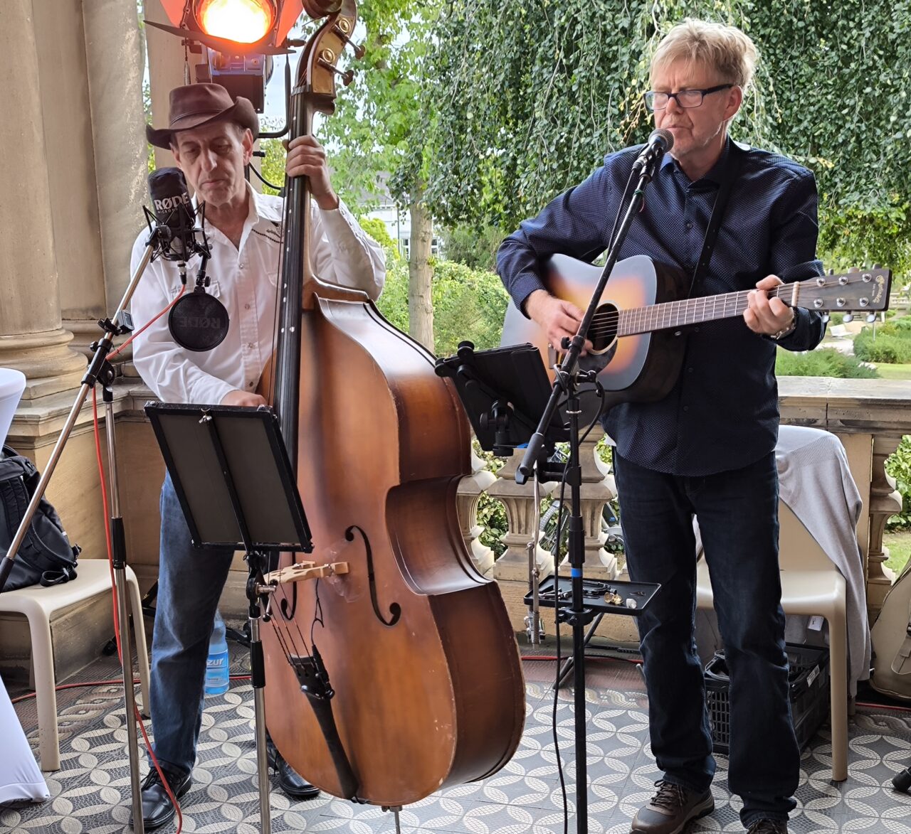 Die Abendstunden konnten mit Musik der „Moonshine Crew“ genossen werden. Das Duo, Heri Wehner (Gitarre und Gesang) und Ingolf Mahlich (Kontrabass, Mandoline und Gesang) spielte in ihrem unverkennbaren akustischen Sound Bluegrass Klassiker und Cover zum Beispiel von den Beatles, den Rolling Stones, CCR, Neil Young, Bob Dylan und Woody Guthrie.